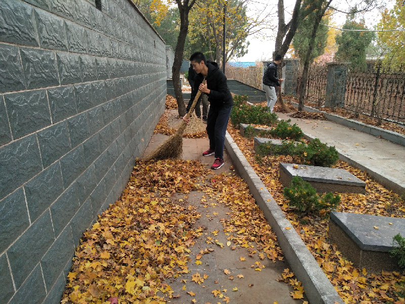 在负责人的带领和安排下,志愿者们来到烈士陵园,每几人一组带着自己的卫生工具认真的打扫自己负责的区域,落叶垃圾倒到指定区域。打扫完毕后集合拍照留念。