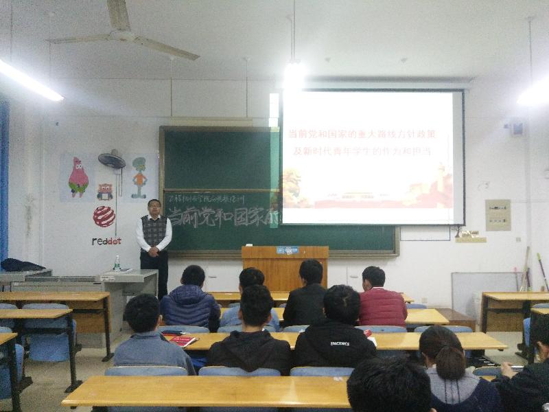 本次培训的主题是:当前党和国家的重大路线、方针、政策及新时代青年学生的作为和担当。吴硕分别从中国的经济、政治、文化、社会、生态五方面分析了国情,并对青年学生提出了一些要求,青年学生要做到有理想、有本领、有担当、知行合一,为社会主义建设献力。