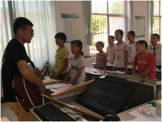 在课堂上,支教老师夏明以现场吉他弹唱的方式,带领孩子们学习具体的乐理知识,学唱经典英文歌曲。以娱乐促进学习,在歌唱中学习,在歌唱中进步。这次音乐课,让孩子们对音乐及英文的兴趣得到了极大的提升,给孩子们打开了一扇窗,让他们发现:其实学习不仅仅只有读书写字,在娱乐玩耍中亦有新知妙趣。课后漫步,你会发现孩子们在用纯真的嗓音哼唱着当地的民谣。