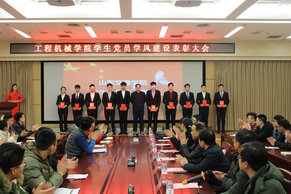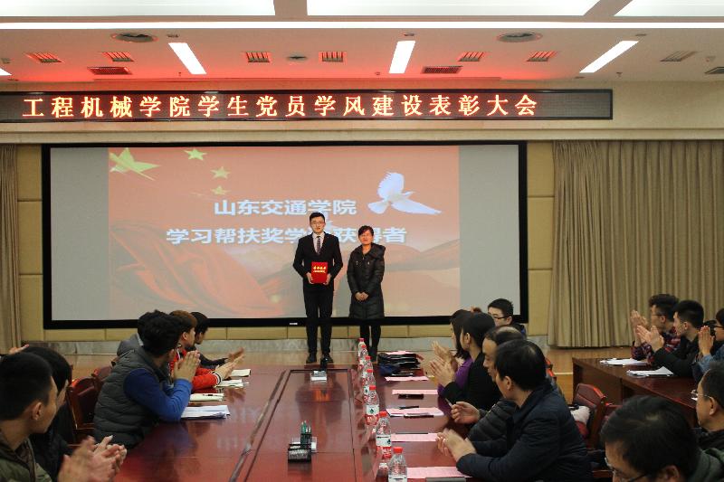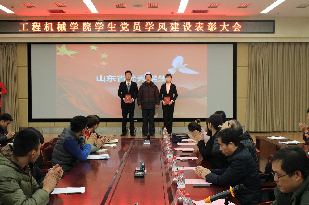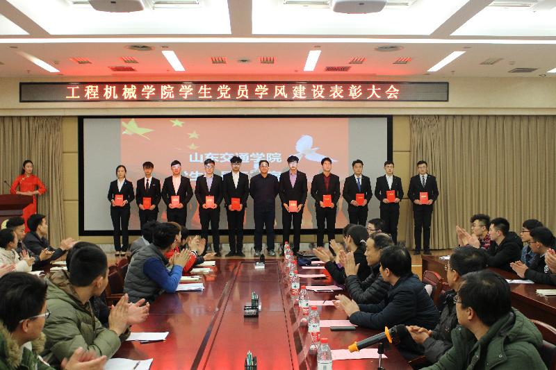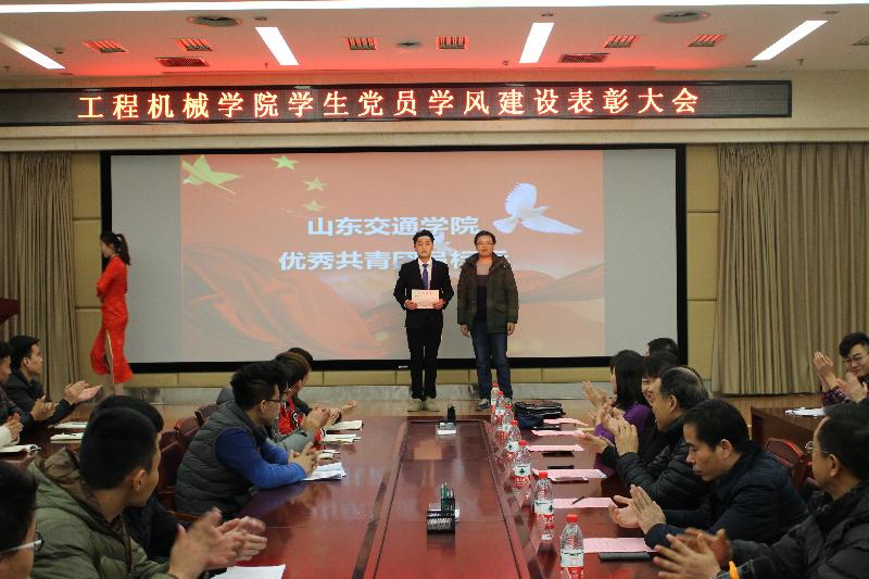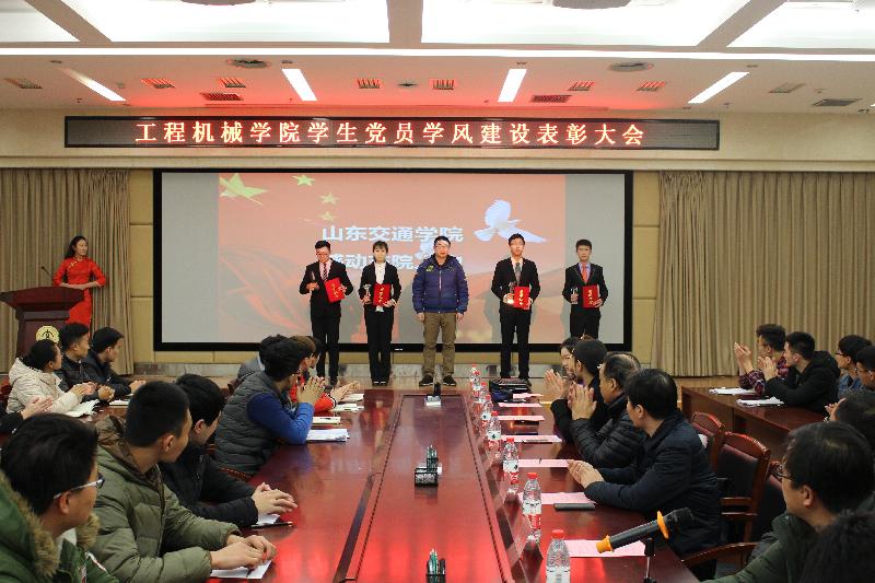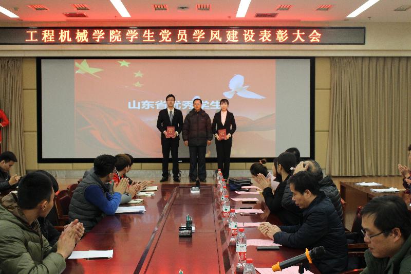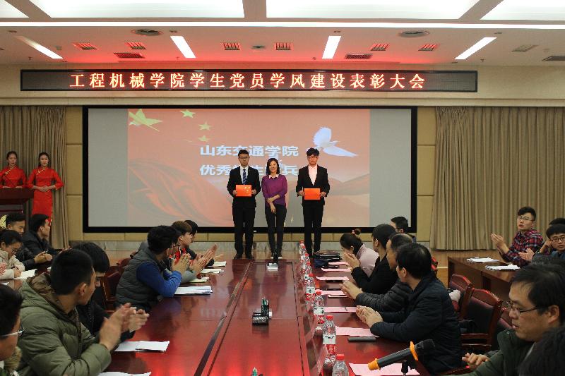 表彰大会在庄严的国歌声中拉开了帷幕。随后,全体党员再次重温了入党誓词,再次明确了为共产主义奋斗终身的理想信念。大会进入表彰仪式,单绍福为获得国家奖学金的学生党员进行颁奖,吴承格为山东省五四红旗团支部获得班级机电152班颁奖,臧发业为山东省优秀学生颁奖、周颜玲为山东省政府奖学金获得者颁奖,张洪丽为山东交通学院优秀学生标兵颁奖,王保平为山东交通学院优秀共青团员标兵颁奖,李筱倩为山东交通学院十佳义工进行颁奖,李光为山东交通学院学生党员示范宿舍,周靖为山东交通学院感动交院人物进行颁奖,张琦为山东交通学院学习帮扶奖学金获得者以及工程机械学院学生党建优秀工作者颁奖。表彰仪式过后,学生党员代表周浩发言,表示将切实发挥学生党员的先锋模范作用,带动同学们形成良好的学习氛围。同时,教师党员代表王保平发言,希望同学们继续努力,争取更大的成绩。最后,单绍福书记做总结发言,他首先对获奖同学表示祝贺,希望受表彰的学生党员要谦虚谨慎,戒骄戒躁,再创佳绩。临近期末,他也对全体学生党员提出要求,要发挥表率作用,以身作则,诚信考试,做优良学风的推动者。