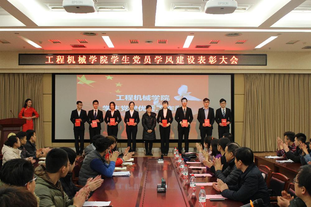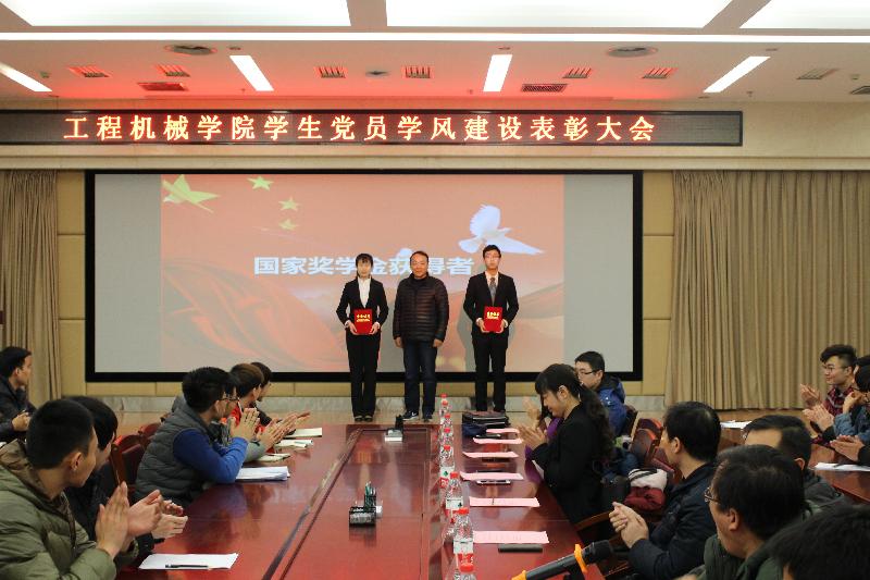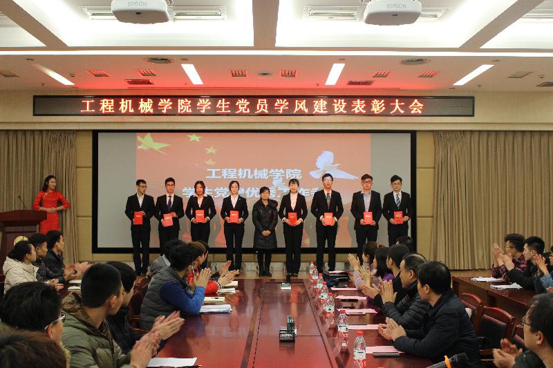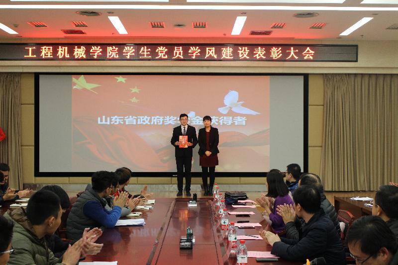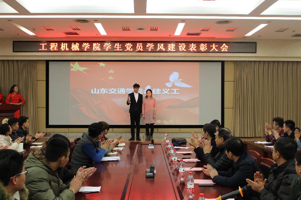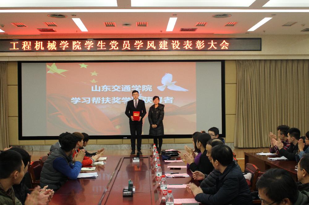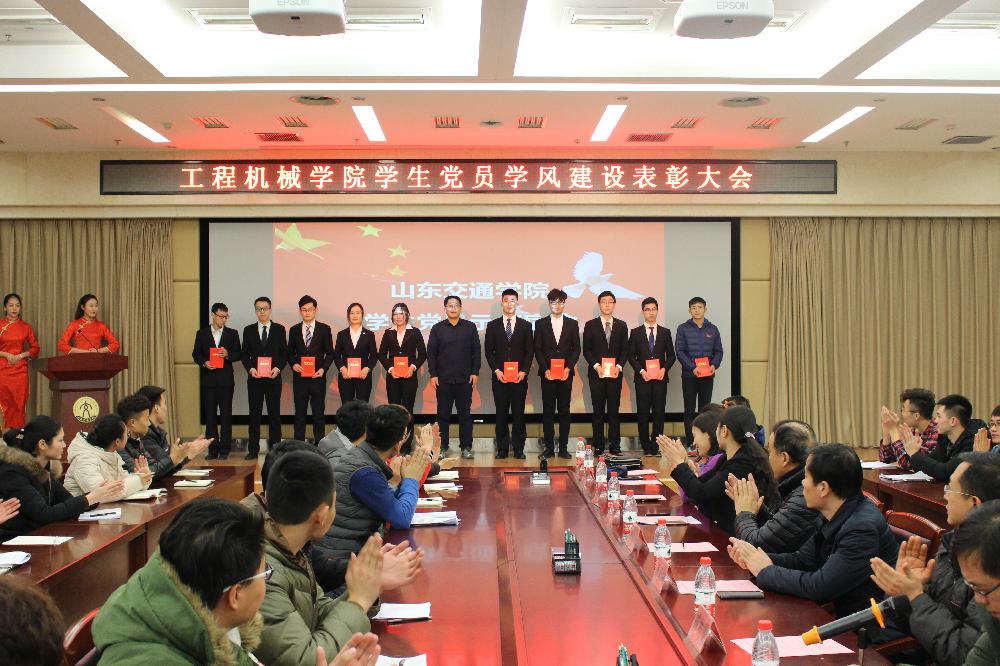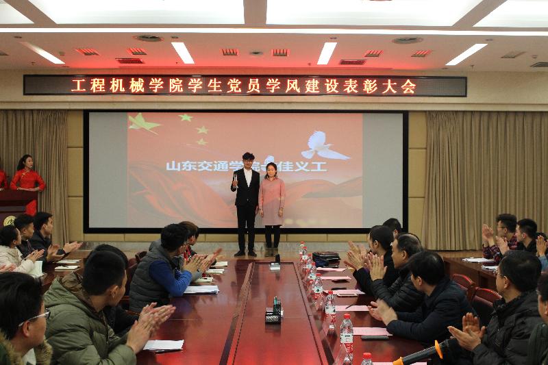 表彰大会在庄严的国歌声中拉开了帷幕。随后,全体党员再次重温了入党誓词,再次明确了为共产主义奋斗终身的理想信念。大会进入表彰仪式,单绍福为获得国家奖学金的学生党员进行颁奖,吴承格为山东省五四红旗团支部获得班级机电152班颁奖,臧发业为山东省优秀学生颁奖、周颜玲为山东省政府奖学金获得者颁奖,张洪丽为山东交通学院优秀学生标兵颁奖,王保平为山东交通学院优秀共青团员标兵颁奖,李筱倩为山东交通学院十佳义工进行颁奖,李光为山东交通学院学生党员示范宿舍,周靖为山东交通学院感动交院人物进行颁奖,张琦为山东交通学院学习帮扶奖学金获得者以及工程机械学院学生党建优秀工作者颁奖。表彰仪式过后,学生党员代表周浩发言,表示将切实发挥学生党员的先锋模范作用,带动同学们形成良好的学习氛围。同时,教师党员代表王保平发言,希望同学们继续努力,争取更大的成绩。最后,单绍福书记做总结发言,他首先对获奖同学表示祝贺,希望受表彰的学生党员要谦虚谨慎,戒骄戒躁,再创佳绩。临近期末,他也对全体学生党员提出要求,要发挥表率作用,以身作则,诚信考试,做优良学风的推动者。