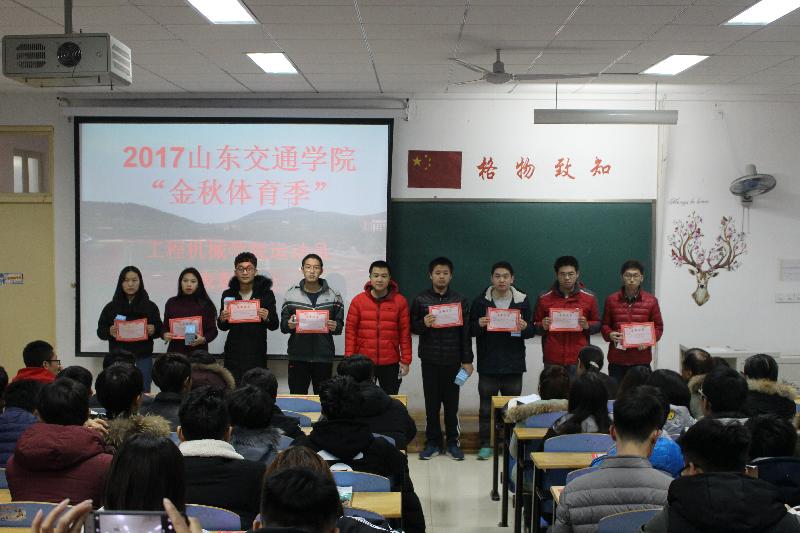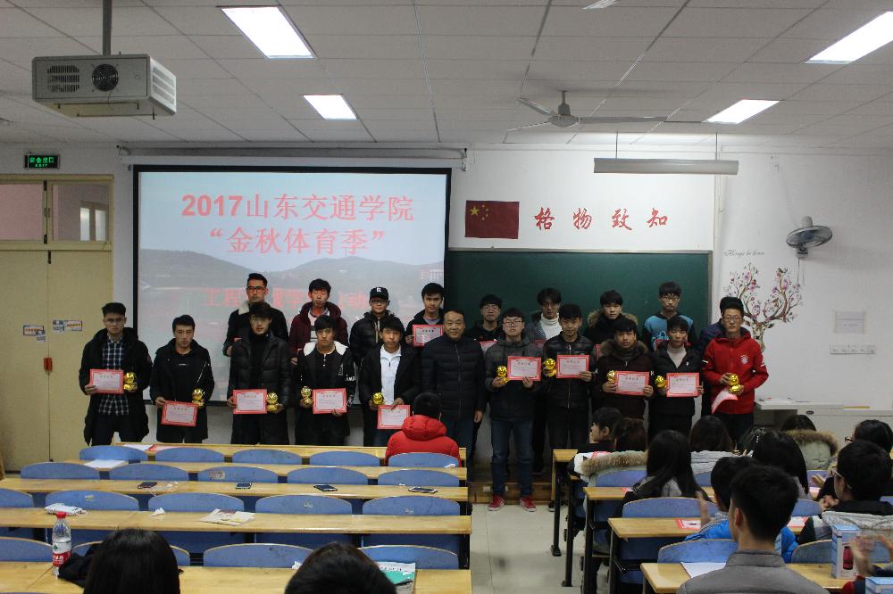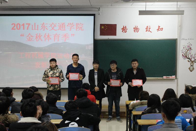 生命在于运动,体育洋溢激情。在秋高气爽、丹桂飘香的金秋时节,我们带着欢乐的心情,踏着幸福的节拍结束了2017年山东交通学院“金秋体育季”的所有比赛项目,我院运动员奋勇拼搏取得了团体总分第三名的好成绩。首先,单绍福书记、周颜玲书记、滕昆老师、我院学生会主席李学晖分别为获奖运动员们办法了荣誉证书。接着,足球队队长董程发言,对此次金秋体育季进行了总结。最后,单书记上台对运动员们的出色表现给予了表扬并指出要再接再厉,争取能够在明年再获佳绩。、