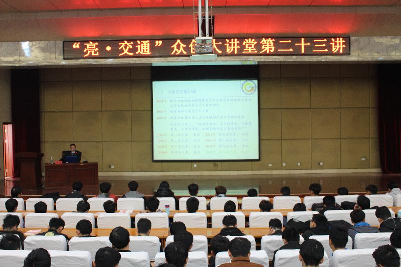 11月21日15:30,西安交通大学工程坊主任、全国大学生机械创新设计大赛组委会秘书处秘书长王晶教授应邀做客我校“亮·交通”众创大讲堂,并在报告厅举行专题讲座。我院分党委书记单绍福、院长吴承格、辅导员宁兴旺以及学生代表500多人参加此次了讲座。