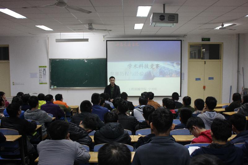 讲座上,宁老师首先具体的介绍作为一个机械学子能参加的科技比赛,并一一列举出。宁老师指出:“同学们要把握好机会,多参加科技比赛,对你们自己的评奖评优以及以后考研、就业都是非常有用的。”随后,宁老师以“‘挑战杯’全国大学生课外学术科技作品竞赛”为例,就以往参赛经验,详细介绍此次“挑战杯”比赛应注意要紧贴社会热点、具有创新性、与专业结合、提高理论可行性、增加实践应用效果这六大方面。最后,宁老师对比赛论文结构强调一些基本要求,并为大家提出了一些切实可行的参赛策略。