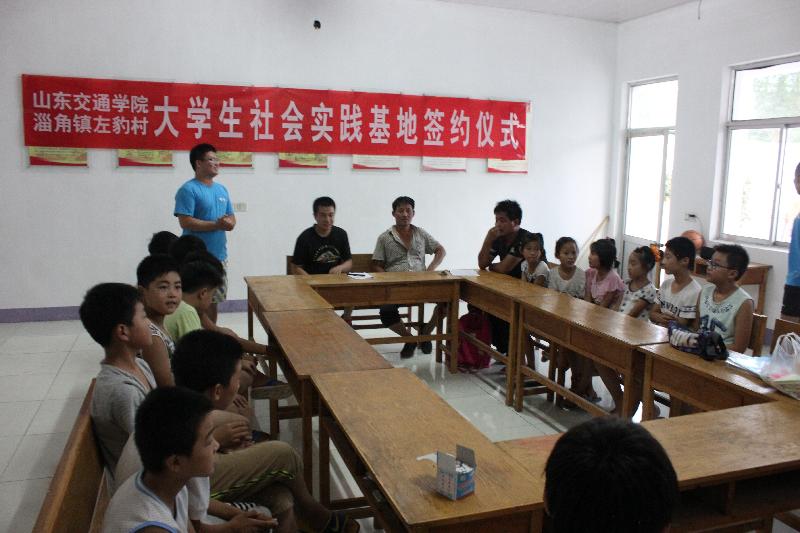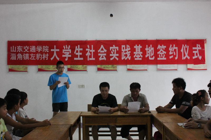 8月9日,山东交通学院在滨州市淄角镇左豹村“大学生社会实践基地”签约仪式启动。签约仪式在左豹村村委会议室举行,我院辅导员滕昆老师同左豹村左主任在协议书上签字。我院爱心服务队全体成员与左豹村村委会主要成员出席了签约仪式。