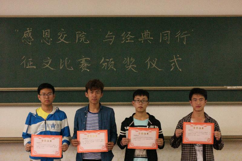 为激发学子的对母校感恩之情,使青年学生在感恩学校中传承中华优秀传统文化,我院特举办“感恩交院,与经典同行”征文比赛。同学们纷纷投稿,我院对来稿进行评比在4月19日于1B304举行颁奖仪式。14级信息部部长董玄出席并主持了此次颁奖仪式。