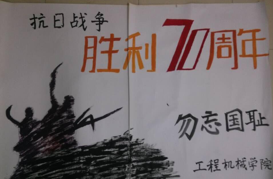 值此中国人民抗日战争暨世界反法西斯战争胜利70周年到来之际,我院开展了制作抗战胜利宣传版等一系列纪念活动,活动旨在指引同学们树立正确的历史观和责任意识,让同学们铭记历史、缅怀先烈、珍爱和平、反对战争。 通过参与相关活动, 让我们明白了一个伟的大真理:正义必胜!和平必胜!人民必胜!