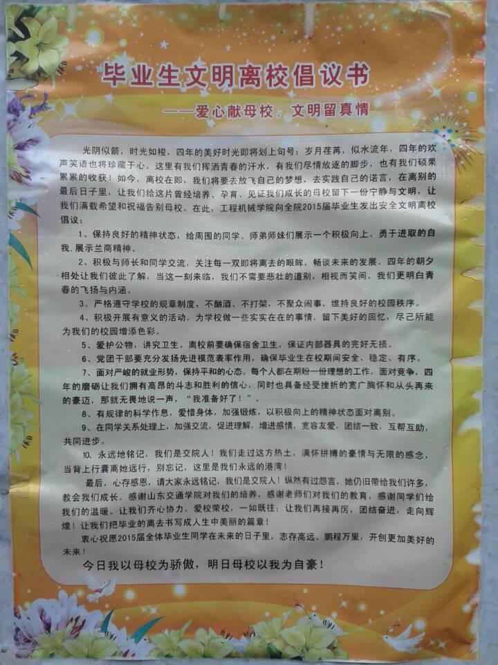 爱心献母校,文明留真情。如今,离校在即,毕业生们满载着希望和祝福离开母校,并发出安全文明离校倡议,为母校留下一份宁静与文明。最后,衷心祝愿我院2015届全体毕业生在未来日子里,志存高远,鹏程万里,开创更加美好的未来。