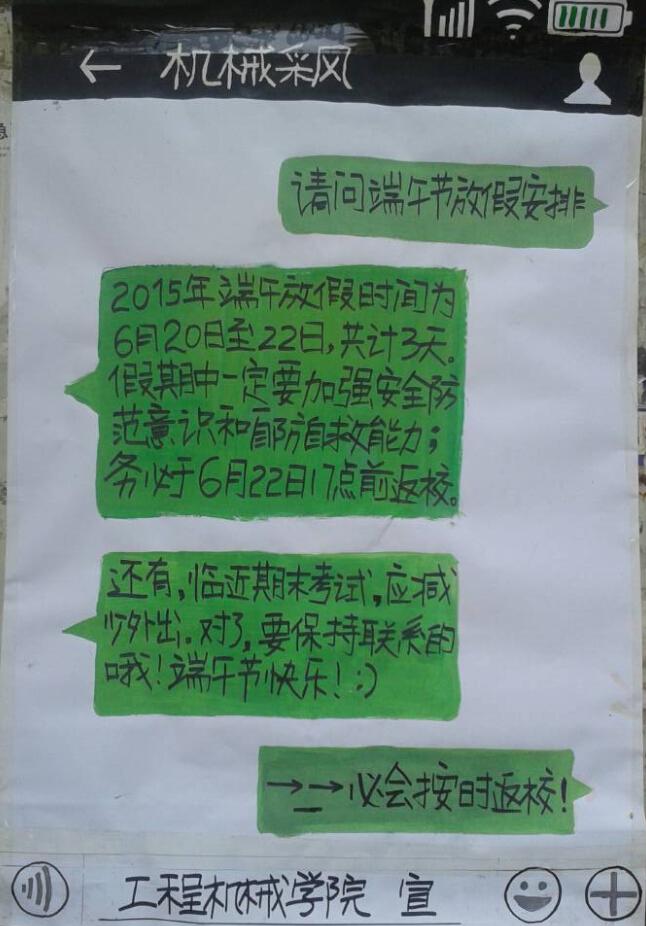 学院以传播校园正能量为宣传中心,以微信等新兴媒体平台为支撑,充分发挥新媒体“全天候”、“零距离”的沟通优势,听取学生心声,接受学生意见,全心全意为学生服务。同时,在宣传方式上更加注重内外结合、传统媒体与新兴媒体结合,对宣传版等传统宣传方式进行了积极变革,结合社会生活热点,打造符合时代潮流、迎合师生喜好的宣传阵地,提高宣传教育工作在师生中的影响力。