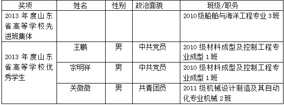 5月7日,2013年度山东省高等学校优秀学生、优秀学生干部以及先进班集体获奖名单公布。