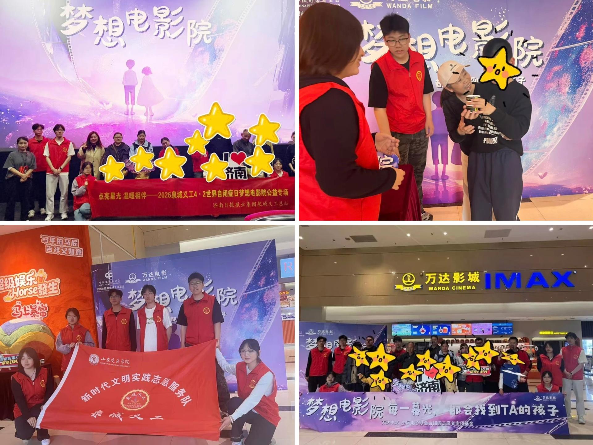 4月2日,第19个世界孤独症日,一场以关爱孤独症儿童为主题的公益观影活动在济南经四路万达影城温情举行。本次活动由济南泉城义工志愿服务中心与万达影城“梦想电影院”项目联合发起,“泉城义工”山东交通学院服务团派出六名大学生志愿者全程参与,用真诚陪伴为“星星的孩子”送去温暖与欢乐。
