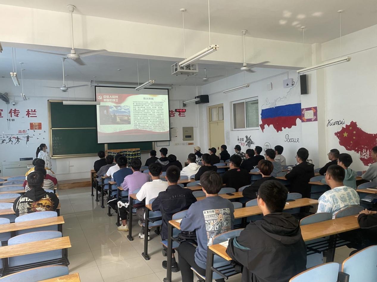 学院将“四史”专题教育学习融入每周的政治学习活动中,以学生自学,集中学习、研讨的形式开展。在集中学习环节,各班团支书提前准备学习内容并交予年级团组织审核,学习会上,由各班团支书带领同学进行“四史”学习,讲解PPT、观看相关视频,多方位、全面、深入剖析学习材料。