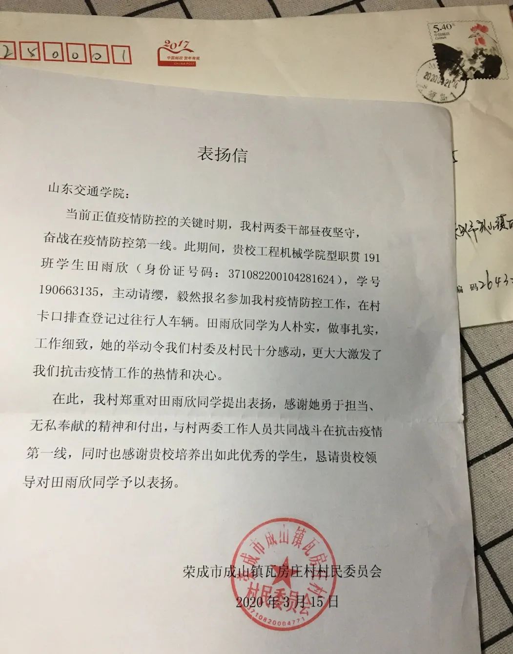 4月28日,我院收到了来自荣成市成山镇瓦房庄村村民委员会的一封表扬信,表扬我院型职贯191田雨欣在疫情防控期间主动请缨,申请成为疫情防控志愿者,毅然参加社区疫情防控工作。