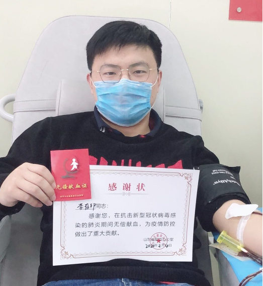 义务献血,奉献爱心。机升182班学子李存印通过关注“山东献血”微信公众号,了解到受新冠肺炎疫情影响,全市医院临床供血紧张,特别是O型血的存量严重不足,他想用力所能及的方式为抗击疫情送去一腔“热血”。在确保自身条件达到献血标准后,他毫不犹豫地前往离家最近的献血屋,经过测量体温、报名登记、健康征询、血液筛查等准备工作后,贡献出了2个治疗量的成分血。此外,他还在春节期间主动捐献积攒的500元兼职工资用于村委会疫情防控工作.