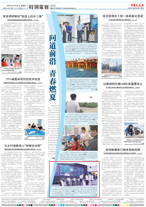 8月28日,《中国交通报》报道我院“青衿智护”调研团深入天意机械、中铁五局、中铁十四局等企业,聚焦智能监测系统在交通基建领域的应用,开展社会实践的事迹进行了报道。全文如下: