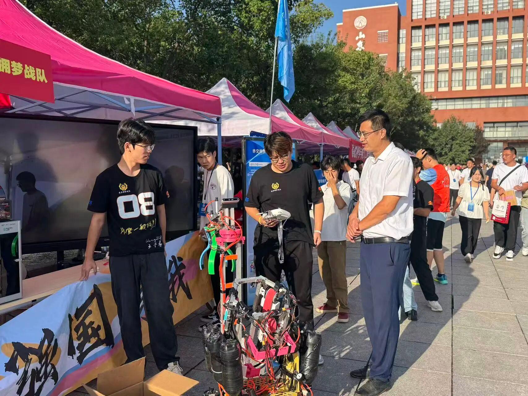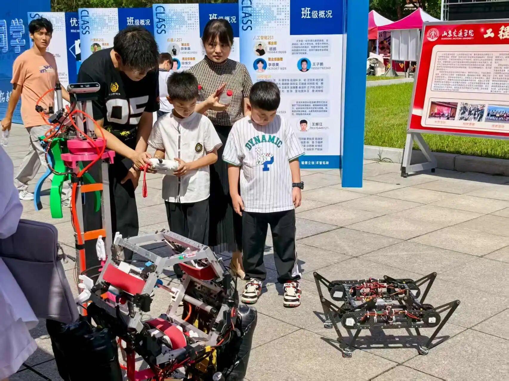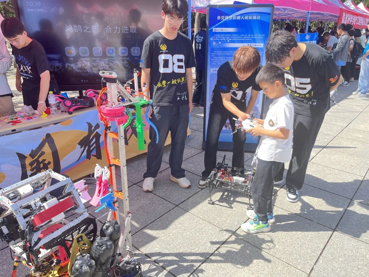 迎新现场,由学生自主设计、研发及调试的机器人——投篮机器人和仿生狗,它们敏捷地转身、灵巧地跳跃、精准的投篮吸引新生们驻足,现场不时爆发出阵阵惊叹声,投篮机器人曾获得第二十四届全国大学生机器人大赛ROBOCON一等奖。
