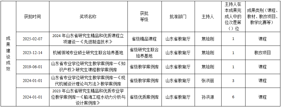 成果实施以来,依托“机械领域专业硕士研究生联合培养基地”,形成了“课程群+案例库+实践基地”的产教融合培养体系。获得教学成果4项,累计立项省级研究生教研教改课题4项,建设省级精品课程1门、省级专业学位教学案例库3个,开发校级优质研究生课程案例库1个、课程思政项目1项,获省级科学技术奖10余项。