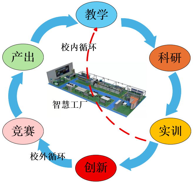 基于“学习工厂”的核心理念,我们致力于构建一个离散型的“高素质技术人才层级式教学体系”。这一教学体系旨在通过产学研相结合的服务机制,打造一个高度仿真的工业环境,从而实现校内小循环和校外大循环的双循环人才培养模式。该教育模式构建了“校园理论实践融合-产业场域深度浸润”的育人机制,通过建立高校教育系统与工业生产系统的双向循环通道,形成理论认知-实践验证-场景应用-问题反哺”的闭环培养体系。使学生在学科知识体系建构过程中,实现工业生产全流程的情境化学习,在真实问题解决中完成从知识接受到实践创新的能力跃迁,培育具备跨界整合能力与系统思维的高素质技术人才。